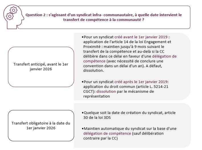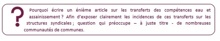 Chaque syndicat faisant face à ses propres caractéristiques, un travail détaillé syndicat par syndicat (au-regard de leurs statuts) nécessite d’être réalisé pour identifier précisément les incidences des transferts de compétence. N’hésitez pas à contacter le cabinet à cet effet qui, dans le cadre d’accompagnement aux transferts des compétences eau et assainissement, a l’habitude de traiter de ces questions.