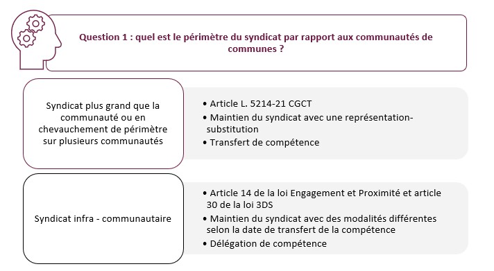 Une part importante de communautés de communes a utilisé sa minorité de blocage pour reporter le transfert obligatoire des compétences eau / assainissement au 1er janvier 2026. Afin d’anticiper cette date, les communautés analysent les enjeux liés à ces transferts qui s’additionnent aux enjeux climatiques avec notamment les épisodes récurrents de sécheresse. Ainsi, le bloc communal doit d’une part réfléchir sur la structuration de ces compétences à l’échelle intercommunale tout en sécurisant l’alimentation en eau potable sur leur secteur. Sur certains territoires, le bloc communal cherche alors à s’assurer d’une ressource en eau suffisante par la réalisation de nouveaux forages pour lesquels une structure de portage type syndicat apparait la plus cohérente. Il est donc important de s’assurer que ces syndicats d’eau et assainissement pourront se maintenir à l’issue des transferts de compétence. La réponse à cette interrogation nécessite une analyse en deux temps.